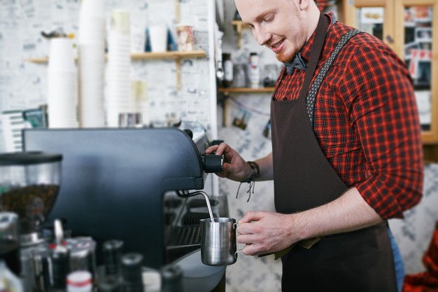 - Tạp dề có túi và dây buộc gọn gàng tại cửa hàng pha chế cafe